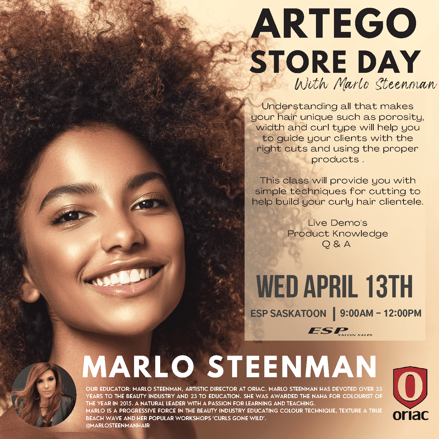 ESP Saskatoon 210 – 44th Street East, Saskatoon, SK, CanadaUnderstanding all that makes your hair unique such as porosity, width and curl type will help you to guide your clients with the right cuts and using the proper products. This class will provide you with simple techniques for cutting to help build your curly hair clientele. Live Demo's Product Knowledge Q & A About